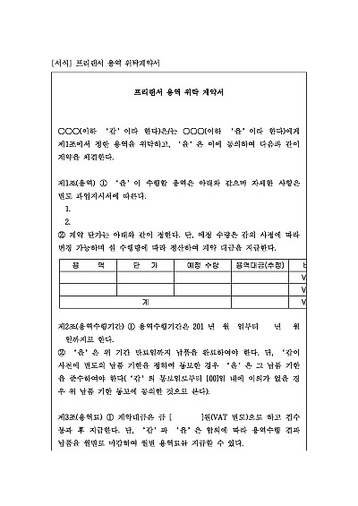 주요내용 : 용역사항 및 단가, 수행기간, 용역료 지급방법, 용역 수행방법, 결과물의 납품 등, 비밀준수, 계약해제 등, 손해배상, 채권양도금지, 계약보증금 등 내용 기재, 단 무단전재 방지목적으로 PDF 파일로 올리니, 구매하신 후 혹 원본 파일이 필요하신 분들은 톡이나 문자, 메일, 전화 등을 주시면 작성방법 등에 대한 간단한 무료상담과 함께 원본 파일을 보내드리도록 하겠습니다.