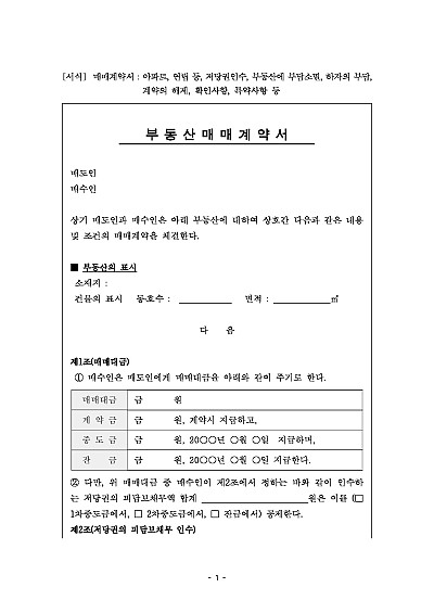 주요내용 : 매도인이 부동산의 소유권을 매수인에게 이전하고, 매수인은 그 대금을 지급하기로 합의하는 내용이 담긴 법적 효력이 있는 문서임. 단 무단전재 방지목적으로 PDF 파일로 올리니, 구매하신 후 혹 원본 파일이 필요하신 분들은 톡이나 문자, 메일, 전화 등을 주시면 작성방법 등에 대한 간단한 무료상담과 함께 원본 파일을 보내드리도록 하겠습니다.