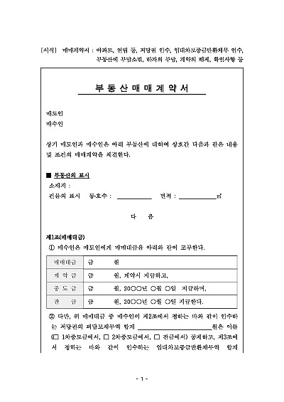 주요내용 매도인이 부동산의 소유권을 매수인에게 이전하고매수인은 그 대금을 지급하기로 합의하는 내용이 담긴 법적 효력이 있는 문서임단 무단전재 방지목적으로 PDF 파일로 올리니구매하신 후 혹 원본 파일이 필요하신 분들은 톡이나 문자메일전화 등을 주시면 작성방법 등에 대한 간단한 무료상담과 함께 원본 파일을 보내드리도록 하겠습니다.