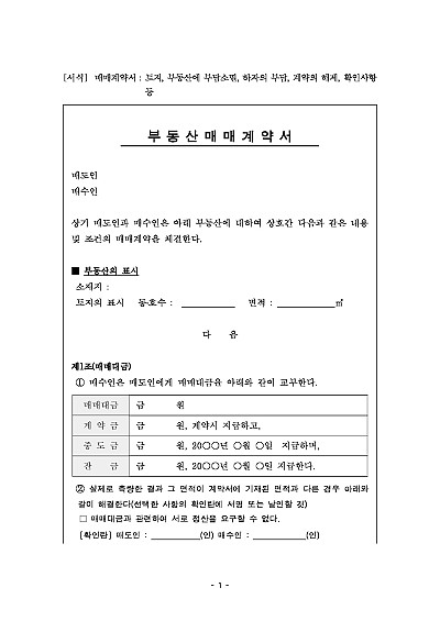 주요내용 매도인이 부동산의 소유권을 매수인에게 이전하고매수인은 그 대금을 지급하기로 합의하는 내용이 담긴 법적 효력이 있는 문서임단 무단전재 방지목적으로 PDF 파일로 올리니구매하신 후 혹 원본 파일이 필요하신 분들은 톡이나 문자메일전화 등을 주시면 작성방법 등에 대한 간단한 무료상담과 함께 원본 파일을 보내드리도록 하겠습니다.