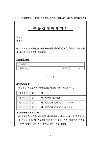 주요내용 : 매도인이 부동산의 소유권을 매수인에게 이전하고, 매수인은 그 대금을 지급하기로 합의하는 내용이 담긴 법적 효력이 있는 문서임. 단 무단전재 방지목적으로 PDF 파일로 올리니, 구매하신 후 혹 원본 파일이 필요하신 분들은 톡이나 문자, 메일, 전화 등을 주시면 작성방법 등에 대한 간단한 무료상담과 함께 원본 파일을 보내드리도록 하겠습니다.