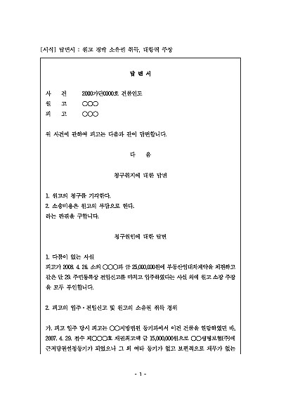 주요내용 피고가 원고의 소장(소송을 제기하며 제출하는 문서) 내용에 대해 자신의 입장을 밝히고 반박하기 위한 목적으로 사용되어지는 서면 양식임단 무단전재 방지 목적으로 PDF 파일로 올리니구매하신 후 혹 원본 파일이 필요하신 분들은 톡이나 문자메일전화 등을 주시면 작성 방법 등에 대한 간단한 무료 상담과 함께 원본 파일을 보내드리도록 하겠습니다.