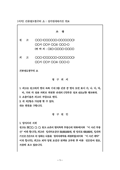 주요내용 임대차 계약 종료, 월세 미납, 불법 점유 등으로 인해 부동산 점유자가 점유를 이전해주지 않을 때, 소유자가 법원에 부동산을 돌려달라는 소를 제기할 때 사용되어지는 양식임단 무단전재 방지 목적으로 PDF 파일로 올리니구매하신 후 혹 원본 파일이 필요하신 분들은 톡이나 문자메일전화 등을 주시면 작성 방법 등에 대한 간단한 무료 상담과 함께 원본 파일을 보내드리도록 하겠습니다.