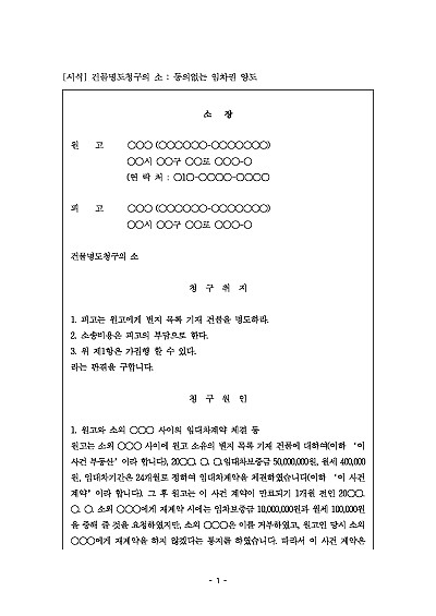 주요내용 임대차 계약 종료, 월세 미납, 불법 점유 등으로 인해 부동산 점유자가 점유를 이전해주지 않을 때, 소유자가 법원에 부동산을 돌려달라는 소를 제기할 때 사용되어지는 양식임단 무단전재 방지 목적으로 PDF 파일로 올리니구매하신 후 혹 원본 파일이 필요하신 분들은 톡이나 문자메일전화 등을 주시면 작성 방법 등에 대한 간단한 무료 상담과 함께 원본 파일을 보내드리도록 하겠습니다.