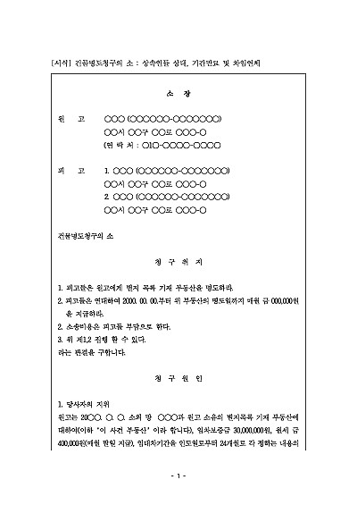 주요내용 : 임대차 계약 종료, 월세 미납, 불법 점유 등으로 인해부동산 점유자가 점유를 이전해주지 않을 때, 소유자가 법원에 부동산을 돌려달라는 소를 제기할 때 사용되어지는 양식임. 단 무단전재 방지 목적으로 PDF 파일로 올리니, 구매하신 후 혹 원본 파일이 필요하신 분들은 톡이나 문자, 메일, 전화 등을 주시면 작성 방법 등에 대한 간단한 무료 상담과 함께 원본 파일을 보내드리도록 하겠습니다.