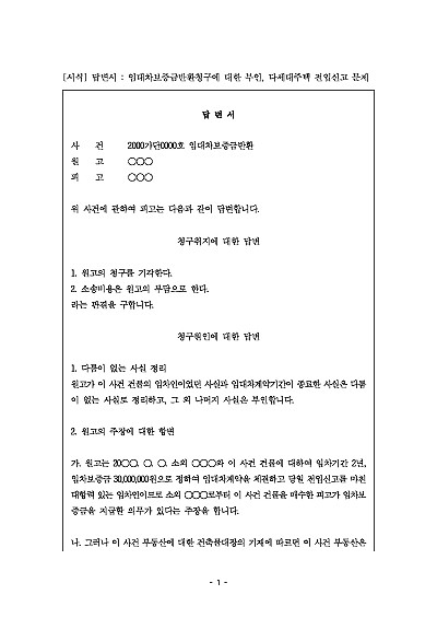 답변서 : 임대차보증금반환청구에 대한 부인, 다세대주택 전입신고 문제 요약정보 및 구매