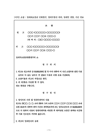 주요내용 : 임대차기간 만료 후 임대인의 보증금 미반환시 그 지급을 구하기 위한 목적으로 사용되어지는 소장 양식임. 단 무단전재 방지 목적으로 PDF 파일로 올리니, 구매하신 후 혹 원본 파일이 필요하신 분들은 톡이나 문자, 메일, 전화 등을 주시면 작성 방법 등에 대한 간단한 무료 상담과 함께 원본 파일을 보내드리도록 하겠습니다.