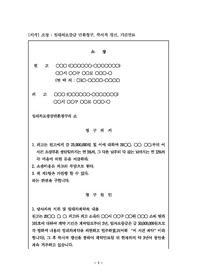 소장 : 임대차보증금 반환청구, 묵시적 갱신, 기간만료 요약정보 및 구매