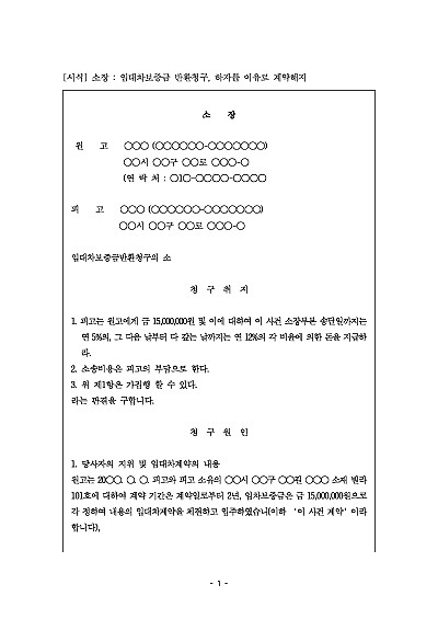 소장 : 임대차보증금 반환청구, 하자를 이유로 계약해지 요약정보 및 구매