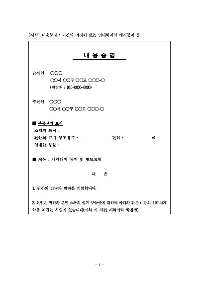 내용증명 : 기간의 약정이 없는 임대차계약 해지통지 등 요약정보 및 구매