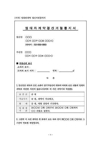 주요내용 : 계약 만료 전 임대인 또는 임차인이 계약을 연장하지 않겠다는 의사를 밝히는 문서 양식임. 단 무단전재 방지목적으로 PDF 파일로 올리니, 구매하신 후 혹 원본 파일이 필요하신 분들은 톡이나 문자, 메일, 전화 등을 주시면 작성방법 등에 대한 간단한 무료상담과 함께 원본 파일을 보내드리도록 하겠습니다.