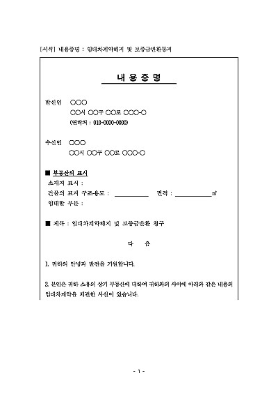 내용증명 : 임대차계약해지 및 보증금반환통지 요약정보 및 구매