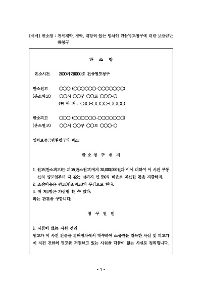 주요내용 : 진행 중인 소송(본소)에서 피고가 원래의 원고를 상대로 동일한 소송 절차 안에서 제기하는 새로운 소송을 의미하며, 피고가 원고에게 자신의 권리를 주장하며 반격하는 반소를 제기할 때 사용되어지는 소장 양식임. 단 무단전재 방지 목적으로 PDF 파일로 올리니, 구매하신 후 혹 원본 파일이 필요하신 분들은 톡이나 문자, 메일, 전화 등을 주시면 작성 방법 등에 대한 간단한 무료 상담과 함께 원본 파일을 보내드리도록 하겠습니다.