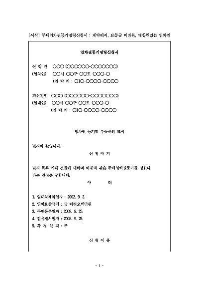 주요내용 : 계약 종료 후 집주인이 보증금을 돌려주지 않을 때, 법원에 신청하여 해당 부동산 등기부에 '임차인이 보증금을 돌려받을 권리가 있다'는 사실을 기록하기 위한 목적으로 사용되어지는 신청서 양식임. 단 무단전재 방지 목적으로 PDF 파일로 올리니, 구매하신 후 혹 원본 파일이 필요하신 분들은 톡이나 문자, 메일, 전화 등을 주시면 작성 방법 등에 대한 간단한 무료 상담과 함께 원본 파일을 보내드리도록 하겠습니다.