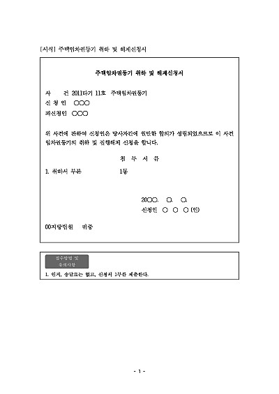 주요내용 : 임차권등기신청 후 상대방과의 합의 등 사정에 의하여 당해 신청의 취하 및 집행해제를 신청할 때 사용되어지는 양식임. 단 무단전재 방지 목적으로 PDF 파일로 올리니, 구매하신 후 혹 원본 파일이 필요하신 분들은 톡이나 문자, 메일, 전화 등을 주시면 작성 방법 등에 대한 간단한 무료 상담과 함께 원본 파일을 보내드리도록 하겠습니다.