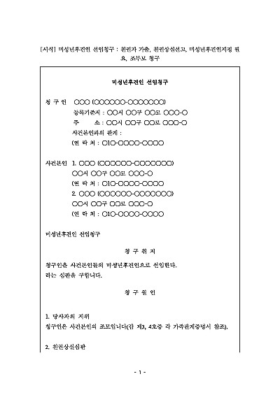 주요내용 미성년자에게 친권자가 없거나 친권자가 역할을 수행하기 어려운 상황에서, 미성년자의 보호와 복리를 위해 가정법원에 후견인 선임을 요청할 때 사용되어지는 신청서 양식임단 무단전재 방지 목적으로 PDF 파일로 올리니구매하신 후 혹 원본 파일이 필요하신 분들은 톡이나 문자메일전화 등을 주시면 작성 방법 등에 대한 간단한 무료 상담과 함께 원본 파일을 보내드리도록 하겠습니다.
