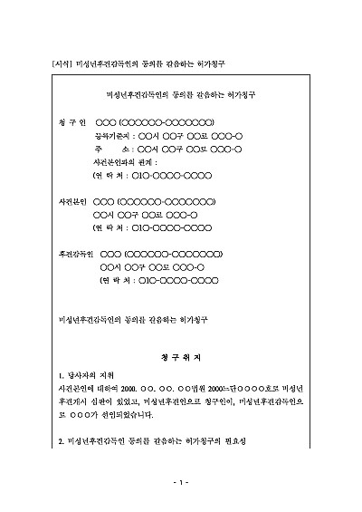 주요내용 : 후견감독인이 미성년후견인(후견인)이 하려는 특정 중요 행위(영업, 금전차용, 의무 부담, 부동산/중요재산 권리 변동, 소송, 상속 관련 협의 등)에 대해 피후견인의 이익을 침해할 우려가 있음에도 동의하지 않을 경우 가정법원에 후견감독인 동의 갈음허가를 청구할 때 사용되어지는 청구서 양식임. 단 무단전재 방지 목적으로 PDF 파일로 올리니, 구매하신 후 혹 원본 파일이 필요하신 분들은 톡이나 문자, 메일, 전화 등을 주시면 작성 방법 등에 대한 간단한 무료 상담과 함께 원본 파일을 보내드리도록 하겠습니다.