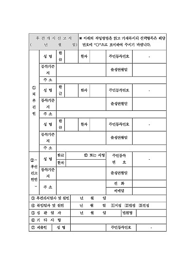 주요내용 : 미성년자에게 친권자가 없거나 친권자가 권한을 행사할 수 없어 후견인이 선임된 경우, 그 사실을 지방자치단체장(시·구·읍·면장)에게 알리는 서식 양식임. 단 무단전재 방지 목적으로 PDF 파일로 올리니, 구매하신 후 혹 원본 파일이 필요하신 분들은 톡이나 문자, 메일, 전화 등을 주시면 작성 방법 등에 대한 간단한 무료 상담과 함께 원본 파일을 보내드리도록 하겠습니다.