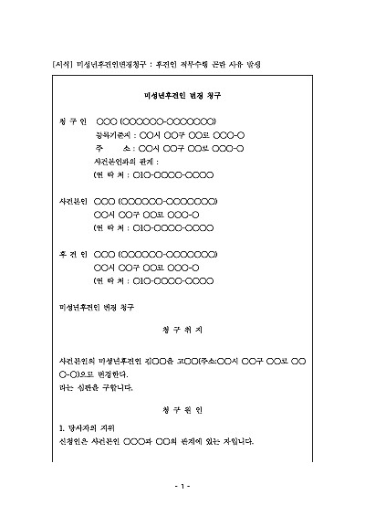 주요내용 : 피후견인(보호가 필요한 사람)의 이익과 복리를 위해 현재의 후견인을 다른 사람으로 교체해 달라고 법원(가정법원)에 신청할 때 사용되어지는 양식임. 단 무단전재 방지 목적으로 PDF 파일로 올리니, 구매하신 후 혹 원본 파일이 필요하신 분들은 톡이나 문자, 메일, 전화 등을 주시면 작성 방법 등에 대한 간단한 무료 상담과 함께 원본 파일을 보내드리도록 하겠습니다.