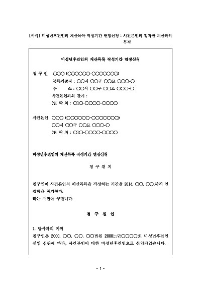 주요내용 : 민법 제941조 제1항에 따라, 후견인은 취임 후 2개월 내에 재산목록을 작성해야 하지만, 정당한 사유의 존재를 이유로 그 기간의 연장을 요청할 때 사용되어지는 신청서 양식임. 단 무단전재 방지 목적으로 PDF 파일로 올리니, 구매하신 후 혹 원본 파일이 필요하신 분들은 톡이나 문자, 메일, 전화 등을 주시면 작성 방법 등에 대한 간단한 무료 상담과 함께 원본 파일을 보내드리도록 하겠습니다.