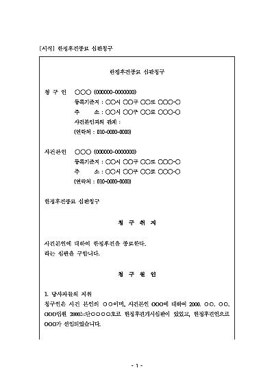 주요내용 질병, 장애 등으로 정신적 제약이 있던 사람이 회복되어 사무 처리 능력이 회복되거나, 사망, 후견인 변경 등으로 한정후견 제도의 필요성이 사라졌을 때 그 종료를 구하기 위한 목적으로 사용되어지는 청구서 양식임단 무단전재 방지목적으로 PDF 파일로 올리니구매하신 후 혹 원본 파일이 필요하신 분들은 톡이나 문자메일전화 등을 주시면 작성방법 등에 대한 간단한 무료상담과 함께 원본 파일을 보내드리도록 하겠습니다.