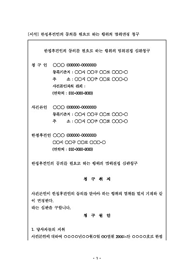 주요내용 : 사건본인의 정신적 제약 정도 변화로 인해 한정후견인의 동의가 필요한 법률행위의 범위를 조정해달라고 가정법원에 요청할 때 사용되어지는 청구서 양식임. 단 무단전재 방지목적으로 PDF 파일로 올리니, 구매하신 후 혹 원본 파일이 필요하신 분들은 톡이나 문자, 메일, 전화 등을 주시면 작성방법 등에 대한 간단한 무료상담과 함께 원본 파일을 보내드리도록 하겠습니다.