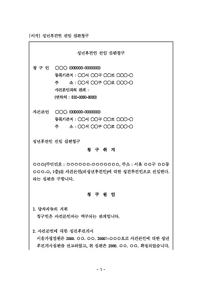 주요내용 : 질병, 장애, 노령 등으로 정신적 제약이 있어 스스로 사무 처리 능력이 부족한 성인(피후견인)을 위해, 법원이 재산관리 및 일상생활을 돕는 성년후견인을 정해달라고 가정법원에 요청하기 위한 목적으로 사용되어지는 청구서 양식임. 단 무단전재 방지목적으로 PDF 파일로 올리니, 구매하신 후 혹 원본 파일이 필요하신 분들은 톡이나 문자, 메일, 전화 등을 주시면 작성방법 등에 대한 간단한 무료상담과 함께 원본 파일을 보내드리도록 하겠습니다.
