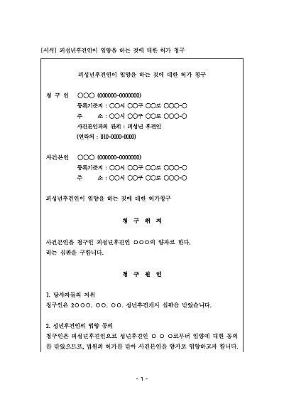 주요내용 : 성년후견인의 동의를 받기 어렵거나(정당한 이유 없이 거부) 부모가 동의를 거부할 경우, 가정법원이 피성년후견인의 복리를 위해 입양의 필요성과 타당성을 심사하여 허가하는 절차임. 단 무단전재 방지목적으로 PDF 파일로 올리니, 구매하신 후 혹 원본 파일이 필요하신 분들은 톡이나 문자, 메일, 전화 등을 주시면 작성방법 등에 대한 간단한 무료상담과 함께 원본 파일을 보내드리도록 하겠습니다.