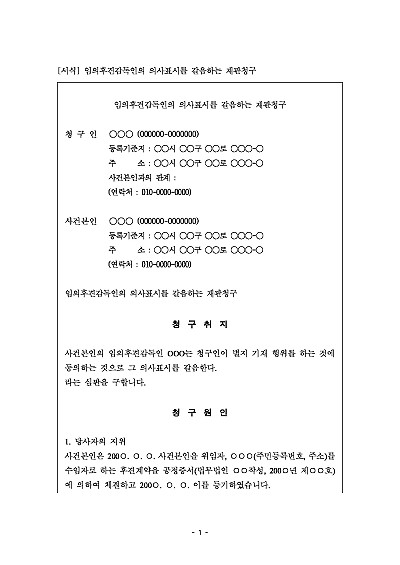 주요내용 : 임의후견계약에 따라 선임된 후견감독인이 피후견인의 이익을 침해하면서도 특정 행위에 대한 동의를 거부하거나, 동의가 필요한 상황에서 후견감독인이 부재하거나 의사표시를 할 수 없을 때, 가정법원에 대신 그 의사표시를 해달라고 요청할 때 사용되어지는 청구서 양식임. 단 무단전재 방지목적으로 PDF 파일로 올리니, 구매하신 후 혹 원본 파일이 필요하신 분들은 톡이나 문자, 메일, 전화 등을 주시면 작성방법 등에 대한 간단한 무료상담과 함께 원본 파일을 보내드리도록 하겠습니다.