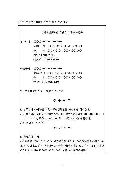 주요내용 : 정당한 사유가 있는 임의후견감독인이 자신의 직무를 그만두기 위해 가정법원에 사임 승인을 구하기 위한 목적으로 사용되어지는 청구서 양식임. 단 무단전재 방지목적으로 PDF 파일로 올리니, 구매하신 후 혹 원본 파일이 필요하신 분들은 톡이나 문자, 메일, 전화 등을 주시면 작성방법 등에 대한 간단한 무료상담과 함께 원본 파일을 보내드리도록 하겠습니다.