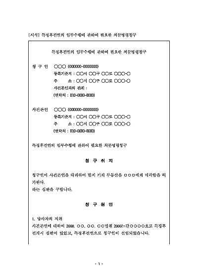 주요내용 : 정신적 제약으로 사무처리 능력이 부족한 피특정후견인의 재산관리 및 신상보호를 위해, 특정후견인이 가정법원에 특정 행위(예: 부동산 매매, 소송 등)에 대한 허가를 구하기 위한 목적으로 사용되어지는 청구서 양식임. 단 무단전재 방지목적으로 PDF 파일로 올리니, 구매하신 후 혹 원본 파일이 필요하신 분들은 톡이나 문자, 메일, 전화 등을 주시면 작성방법 등에 대한 간단한 무료상담과 함께 원본 파일을 보내드리도록 하겠습니다.