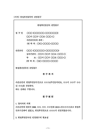 주요내용 : 질병, 장애 등으로 사무처리 능력이 부족한 성인(피한정후견인)을 보호하기 위해 선임된 한정후견인의 업무를 감독하고, 필요시 피한정후견인을 보호하기 위해 가정법원에 감독인 선임을 요청할 목적으로 사용되어지는 청구서 양식임. 단 무단전재 방지 목적으로 PDF 파일로 올리니, 구매하신 후 혹 원본 파일이 필요하신 분들은 톡이나 문자, 메일, 전화 등을 주시면 작성 방법 등에 대한 간단한 무료 상담과 함께 원본 파일을 보내드리도록 하겠습니다.