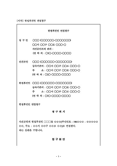 주요내용 : 질병, 장애 등으로 정신적 제약이 있는 피한정후견인의 복리를 위해 현재 선임된 한정후견인을 다른 사람으로 바꾸어 달라고 가정법원에 신청하기 위한 목적으로 사용되어지는 청구서 양식임. 단 무단전재 방지 목적으로 PDF 파일로 올리니, 구매하신 후 혹 원본 파일이 필요하신 분들은 톡이나 문자, 메일, 전화 등을 주시면 작성 방법 등에 대한 간단한 무료 상담과 함께 원본 파일을 보내드리도록 하겠습니다.