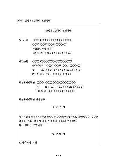 주요내용 후견감독인의 임무 수행에 문제가 있거나(후견감독인 변경 청구), 감독인이 사임(사임 허가 청구)하려 할 때, 가정법원에 현재 감독인을 바꾸거나 새로운 감독인을 선임해 달라고 요청하기 위한 목적으로 사용되어지는 청구서 양식임단 무단전재 방지 목적으로 PDF 파일로 올리니구매하신 후 혹 원본 파일이 필요하신 분들은 톡이나 문자메일전화 등을 주시면 작성 방법 등에 대한 간단한 무료 상담과 함께 원본 파일을 보내드리도록 하겠습니다.