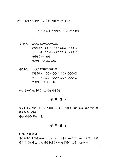 주요내용 : 후견인의 임무가 끝났을 때(종료), 피후견인의 재산을 관리한 내역을 정리(관리계산)해야 하는데, 이 계산을 1개월 이내에 하기 어려운 정당한 사유가 있을 경우 법원에 기간 연장을 해달라고 신청할 때 사용되어지는 양식임. 단 무단전재 방지목적으로 PDF 파일로 올리니, 구매하신 후 혹 원본 파일이 필요하신 분들은 톡이나 문자, 메일, 전화 등을 주시면 작성방법 등에 대한 간단한 무료상담과 함께 원본 파일을 보내드리도록 하겠습니다.