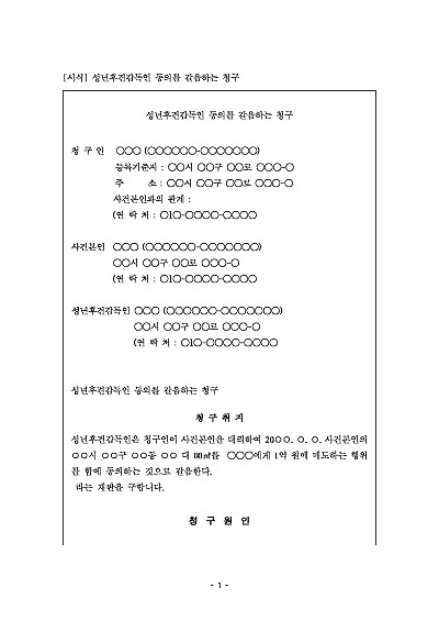 주요내용 : 후견인이 피후견인을 위해 중요한 법률행위를 하려 할 때, 후견감독인의 동의가 필요한데 감독인이 부당하게 동의를 거부하거나 동의가 불가능한 경우, 가정법원에 감독인의 동의를 대신해 달라고 요청할 때 사용되어지는 청구서 양식임. 단 무단전재 방지 목적으로 PDF 파일로 올리니, 구매하신 후 혹 원본 파일이 필요하신 분들은 톡이나 문자, 메일, 전화 등을 주시면 작성 방법 등에 대한 간단한 무료 상담과 함께 원본 파일을 보내드리도록 하겠습니다.