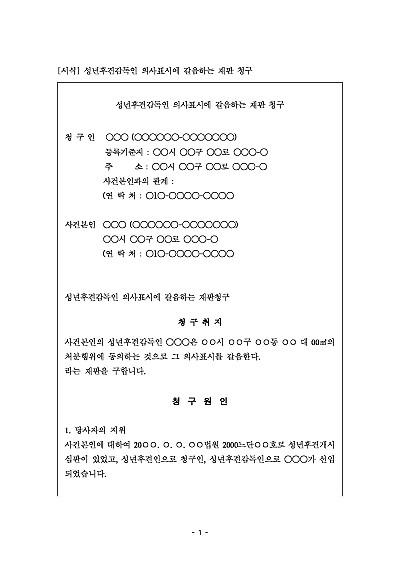 주요내용 : 성년후견인과 피성년후견인 간 이해상반 행위 시 성년후견인이 피성년후견인 대신 법률행위를 할 수 있도록 가정법원에 특별대리인 선임을 청구하거나, 혹은 성년후견감독인이 그 의사표시를 대신하는 결정을 내려달라고 법원에 청구하기 위한 목적으로 사용되어지는 청구서 양식임. 단 무단전재 방지 목적으로 PDF 파일로 올리니, 구매하신 후 혹 원본 파일이 필요하신 분들은 톡이나 문자, 메일, 전화 등을 주시면 작성 방법 등에 대한 간단한 무료 상담과 함께 원본 파일을 보내드리도록 하겠습니다.