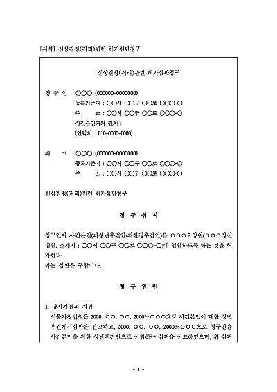 주요내용 : 성년후견인이 피후견인의 시설 격리나 신체를 침해하는 의료 행위 등 중요한 신상 결정을 위한 법원의 허가를 받기 위하여 사용되어지는 청구서 양식임. 단 무단전재 방지목적으로 PDF 파일로 올리니, 구매하신 후 혹 원본 파일이 필요하신 분들은 톡이나 문자, 메일, 전화 등을 주시면 작성방법 등에 대한 간단한 무료상담과 함께 원본 파일을 보내드리도록 하겠습니다.