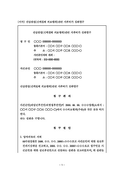 주요내용 성년후견인이 피성년후견인의 신체를 침해하는 의료행위를 긴급하게 실시한 후, 사후적으로 가정법원의 허가를 구하기 위한 목적으로 사용되어지는 청구서 양식임단 무단전재 방지목적으로 PDF 파일로 올리니구매하신 후 혹 원본 파일이 필요하신 분들은 톡이나 문자메일전화 등을 주시면 작성방법 등에 대한 간단한 무료상담과 함께 원본 파일을 보내드리도록 하겠습니다.