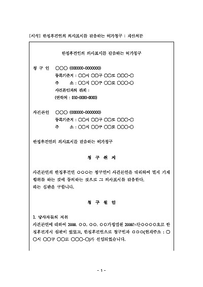 주요내용 : 피한정후견인에게 중요한 법률행위가 필요한데 한정후견인이 정당한 이유 없이 동의하지 않거나 동의를 거부하여 피한정후견인의 이익이 침해될 우려가 있을 때, 피한정후견인 또는 이해관계인이 가정법원에 청구하여 한정후견인의 동의를 법원이 대신 승인해주는 허가를 구하기 위한 목적으로 사용되어지는 청구서 양식임. 단 무단전재 방지목적으로 PDF 파일로 올리니, 구매하신 후 혹 원본 파일이 필요하신 분들은 톡이나 문자, 메일, 전화 등을 주시면 작성방법 등에 대한 간단한 무료상담과 함께 원본 파일을 보내드리도록 하겠습니다.