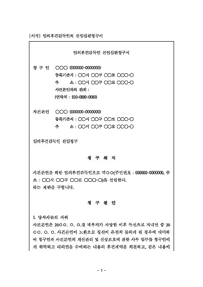주요내용 : 기 체결한 후견계약에 따라 본인이 사무처리 능력이 부족해졌을 때, 계약의 효력을 발생시키고 임의후견인의 업무를 감독할 감독인을 가정법원에 청구하여 선임하기 위해 사용되어지는 청구서 양식임. 단 무단전재 방지목적으로 PDF 파일로 올리니, 구매하신 후 혹 원본 파일이 필요하신 분들은 톡이나 문자, 메일, 전화 등을 주시면 작성방법 등에 대한 간단한 무료상담과 함께 원본 파일을 보내드리도록 하겠습니다.