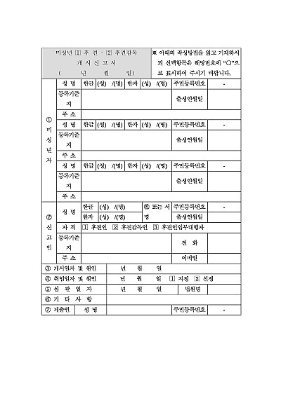 주요내용 : 미성년자에게 후견감독인이 선임되었을 때, 후견감독인이 자신의 취임 사실을 관할 행정청(시·구·읍·면)에 알리기 위해 제출하는 서류 양식임. 단 무단전재 방지 목적으로 PDF 파일로 올리니, 구매하신 후 혹 원본 파일이 필요하신 분들은 톡이나 문자, 메일, 전화 등을 주시면 작성 방법 등에 대한 간단한 무료 상담과 함께 원본 파일을 보내드리도록 하겠습니다.