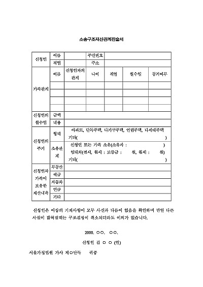 주요내용 : 소송비용을 낼 경제적 능력이 부족한 사람이 법원에 소송구조를 신청하면서 자신의 재산 및 소득 상황을 상세히 밝힐 때 사용되어지는 문서 양식임. 단 무단전재 방지목적으로 PDF 파일로 올리니, 구매하신 후 혹 원본 파일이 필요하신 분들은 톡이나 문자, 메일, 전화 등을 주시면 작성방법 등에 대한 간단한 무료상담과 함께 원본 파일을 보내드리도록 하겠습니다.