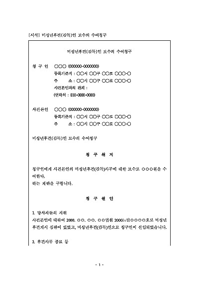 주요내용 : 미성년후견인이나 미성년후견감독인이 미성년자를 위해 후견 업무를 수행한 대가로 피후견인(미성년자)의 재산에서 상당한 보수를 법원에 청구할 때 사용되어지는 청구서 양식임. 단 무단전재 방지목적으로 PDF 파일로 올리니, 구매하신 후 혹 원본 파일이 필요하신 분들은 톡이나 문자, 메일, 전화 등을 주시면 작성방법 등에 대한 간단한 무료상담과 함께 원본 파일을 보내드리도록 하겠습니다.