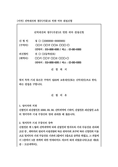 주요내용 : 신탁재산과 관련된 물건에 부합, 혼화, 가공 등의 사유가 발생하여 소유권의 귀속이 불분명해졌을 때, 법원의 재판을 통해 그 소유 관계를 명확히 하기 위한 목적으로 사용되어지는 신청서 양식임단 무단전재 방지목적으로 PDF 파일로 올리니구매하신 후 혹 원본 파일이 필요하신 분들은 톡이나 문자메일전화 등을 주시면 작성방법 등에 대한 간단한 무료상담과 함께 원본 파일을 보내드리도록 하겠습니다.