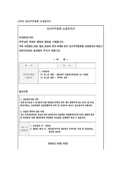 주요내용 : 주주총회를 개최하기 위해 회사(이사회 또는 대표이사)가 각 주주에게 주주총회 일시, 장소, 의안 등의 중요 정보를 미리 서면으로 알리는 공식적인 통지서 양식임. 단 무단전재 방지목적으로 PDF 파일로 올리니, 구매하신 후 혹 원본 파일이 필요하신 분들은 톡이나 문자, 메일, 전화 등을 주시면 작성방법 등에 대한 간단한 무료상담과 함께 원본 파일을 보내드리도록 하겠습니다.