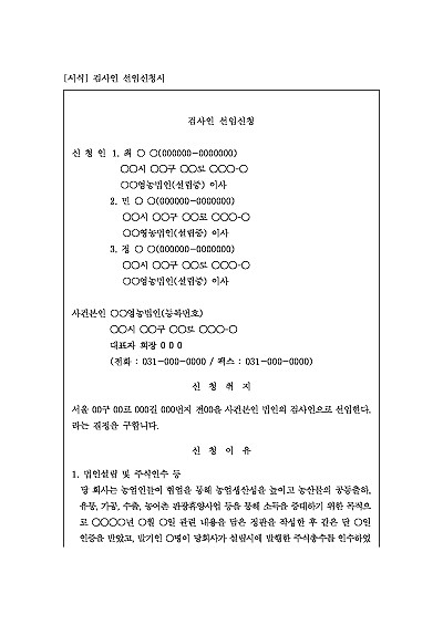 주요내용  이는 법인의 운영이 적법하고 공정하게 이루어지는지 확인하기 위한 절차로, 법률 전문가(변호사, 법무사 등)가 선임되어 법인의 업무, 재산 상황 등을 조사하고 법원에 보고하게 하기 위한 목적으로 사용되어지는  신청서 양식임단 무단전재 방지목적으로 PDF 파일로 올리니구매하신 후 혹 원본 파일이 필요하신 분들은 톡이나 문자메일전화 등을 주시면 작성방법 등에 대한 간단한 무료상담과 함께 원본 파일을 보내드리도록 하겠습니다.