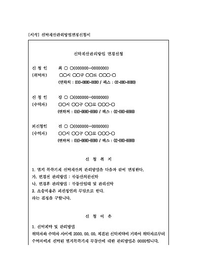 주요내용 : 이미 설정된 신탁계약에 따라 수탁자가 관리하던 재산의 관리 방식이나 내용(예: 부동산 임대, 처분 방식 등)을 변경하기 위해 법원에 변경을 요청할 때 사용되어지는 신청서 양식임. 단 무단전재 방지목적으로 PDF 파일로 올리니, 구매하신 후 혹 원본 파일이 필요하신 분들은 톡이나 문자, 메일, 전화 등을 주시면 작성방법 등에 대한 간단한 무료상담과 함께 원본 파일을 보내드리도록 하겠습니다.