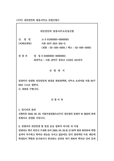 주요내용 : 재단법인의 명칭 및 사무소 선정신청은 유언에 의해 재단법인을 설립할 때, 유언자가 정관에 법인의 명칭이나 사무소 소재지를 지정하지 않은 경우, 유언집행자가 이를 보충하여 주무관청에 승인을 구하기 위한 목적으로 사용되어지는 신청서 양식임. 단 무단전재 방지목적으로 PDF 파일로 올리니, 구매하신 후 혹 원본 파일이 필요하신 분들은 톡이나 문자, 메일, 전화 등을 주시면 작성방법 등에 대한 간단한 무료상담과 함께 원본 파일을 보내드리도록 하겠습니다.