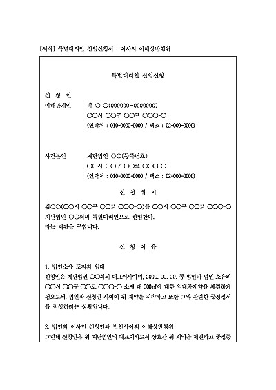 주요내용 : 법인의 이사 개인과 법인 자신의 이익이 충돌하는 거래나 법률행위를 할 때, 이사가 자신의 대표권을 행사하지 못하고, 법인을 대신해 특정 행위를 할 수 있는 특별대리인을 선임하기 위한 목적으로 사용되어지는 신청서 양식임. 단 무단전재 방지목적으로 PDF 파일로 올리니, 구매하신 후 혹 원본 파일이 필요하신 분들은 톡이나 문자, 메일, 전화 등을 주시면 작성방법 등에 대한 간단한 무료상담과 함께 원본 파일을 보내드리도록 하겠습니다.